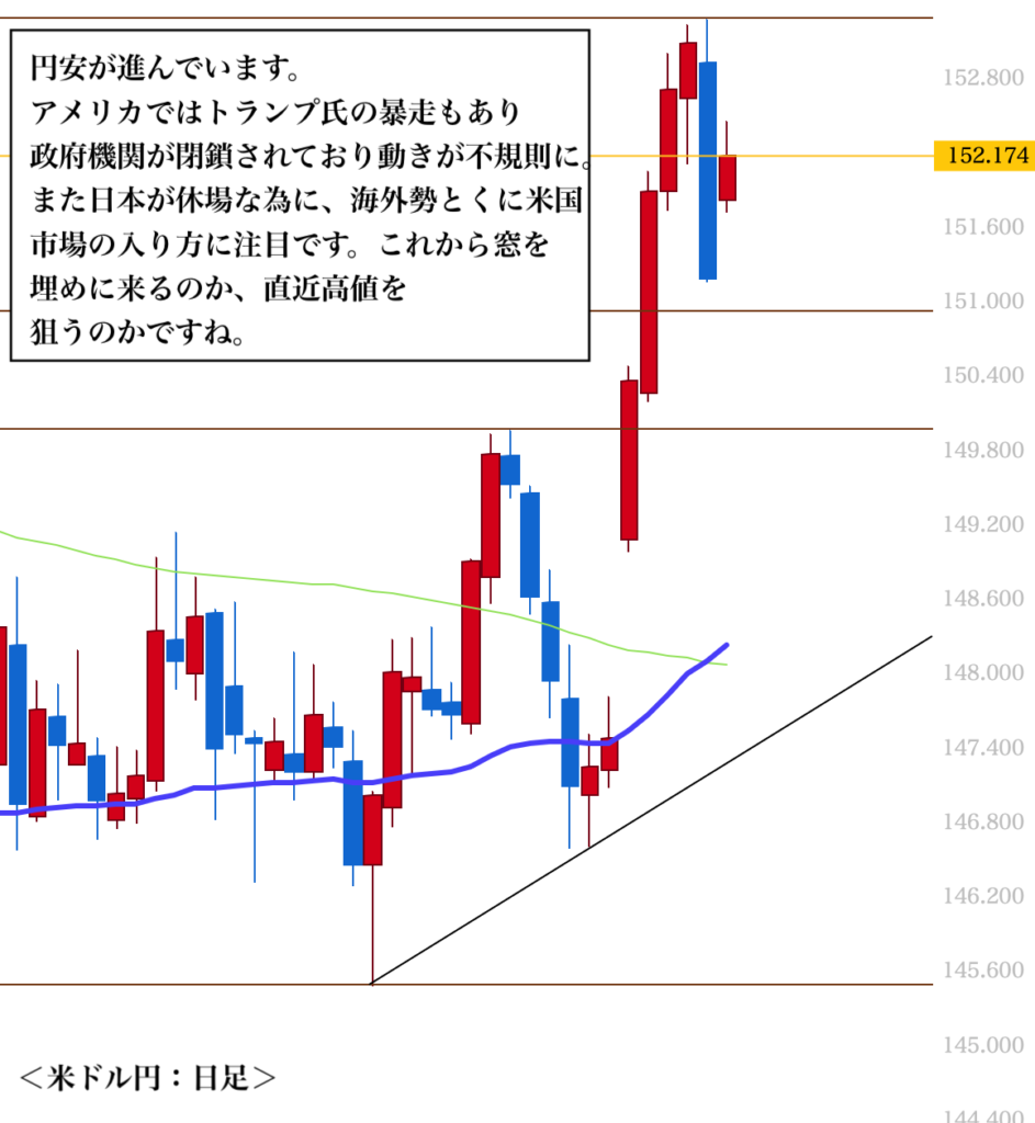 進む円安。 日々の分析 2025.10.13 おはようございます。ハヤテです。 現在の相場を見てみましょう。 米ドル円の日足です。 トランプ大統領の発言で大きく揺れています。 今晩の海外勢の参加でどうなるのか。 今日は特に大きな指標発表はありません。 それでは今日で連休も終わってしまいますが、良い1週間にしましょう!😊
